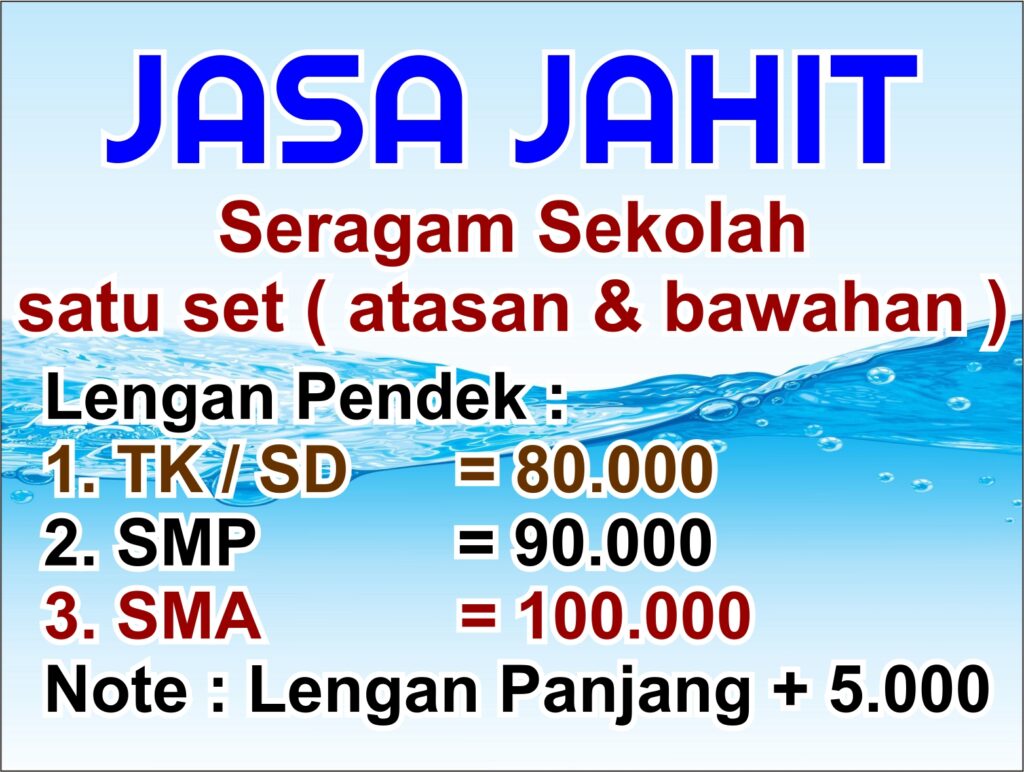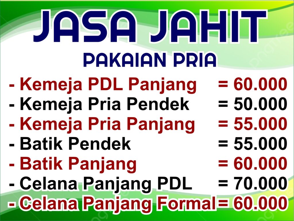 Melayani jasa jahit : - Baju Batik - Baju pria & wanita - Baju PDH - Baju PDL - Seragam Sekolah - Seragam Olahraga dll. Model & ukuran bisa custom. Pesanan Partai Besar , harga bisa NEGO Untuk Kemudahan Anda, kami juga melayani pengukuran langsung ke lokasi